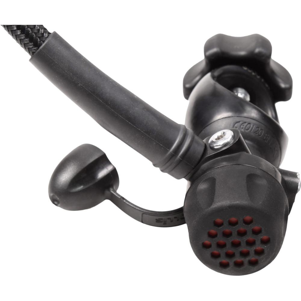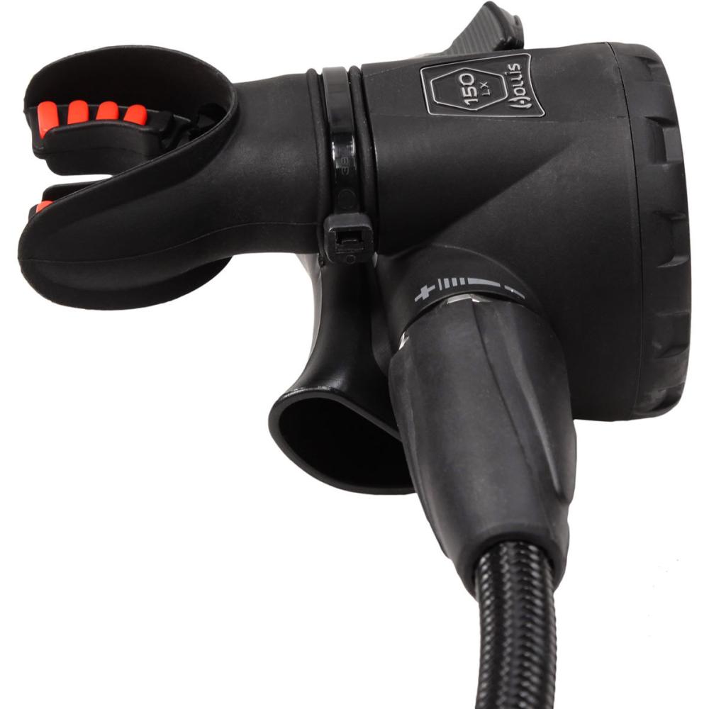 The pneumatically balanced 150XL Second Stage Regulator ensures smooth, easy breathing due to its chrome-plated brass valve. It has a reversible demand valve, allowing for right or left-handed hose configurations, and an adjustable Dive/Pre-Dive switch with a soft rubber grip. The ergonomic design channels bubbles away from the field of view and reduces exhaust effort. The improved orthodontic mouthpiece features dual color tabs and a stainless steel ring. A CD owner's manual is included.