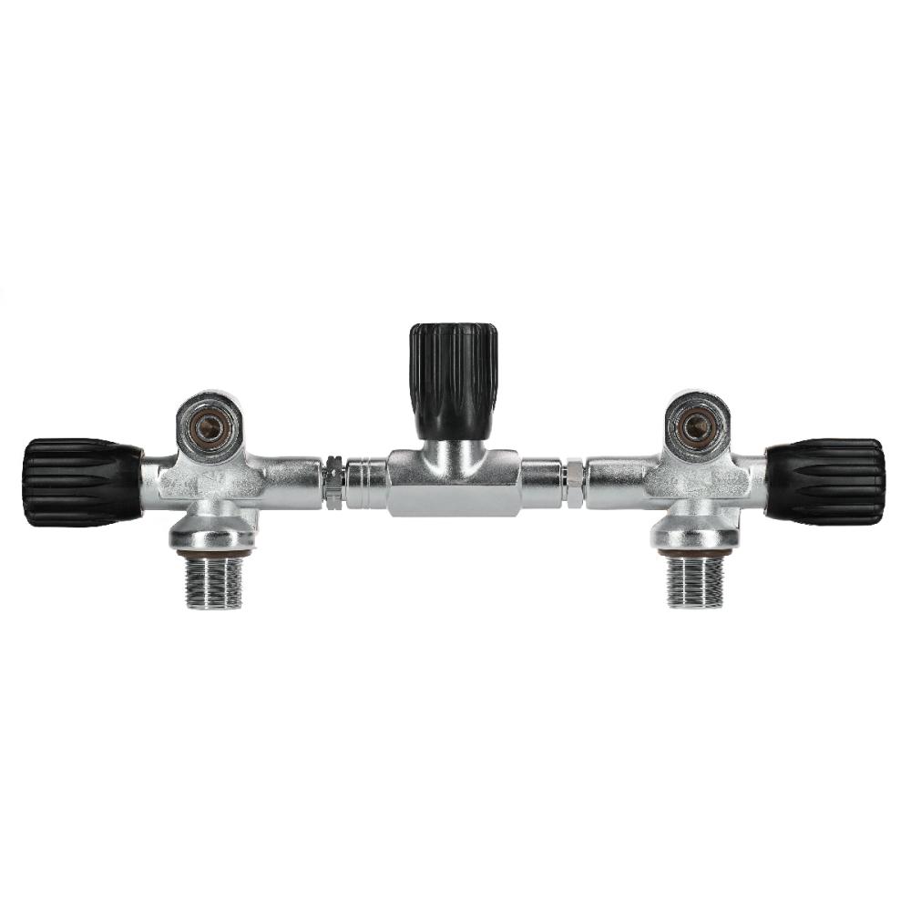 Dive Rite’s 200 Bar Manifold uses two barrel O-rings to seal either end of the cross-bar, providing better shock absorption than the old-style metal-to-metal seal manifolds. Our 200 bar manifold has a 180 mm isolation crossbar that fits both 7.25-inch and 8-inch diameter tanks and recessed burst disks are protected from accidental shearing. Shock absorbing ribbed rubber knobs are rugged, yet easy to manipulate. Dive Rite manifolds come standard for 3500 psi service pressure, with Viton o-rings and oxygen compatible lubricants and are Nitrox ready up to 40 percent. Can be used with both 200 bar and 300 bar regulators.