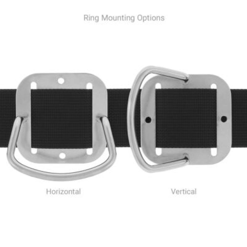This 3-inch rigid D-ring is 316 stainless steel, and the ring is connected to the base plate with two Phillips head screws allowing the mounting orientation to be switched between horizontal and vertical. The D-ring can be worn vertically on the waist strap or horizontally on the shoulder. It provides a large area of attachment, which is helpful to cold water divers who wear heavy mitts.