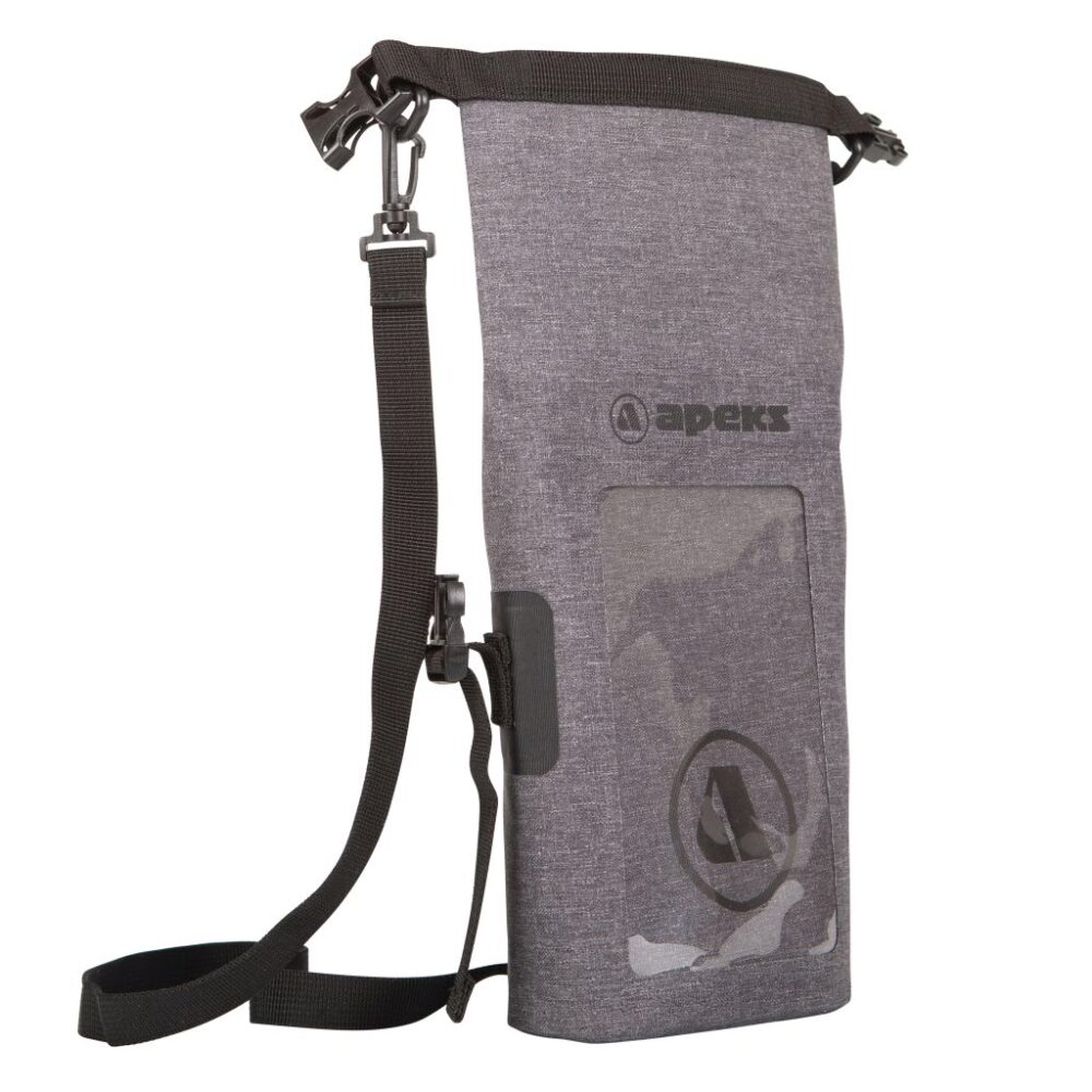 Need to keep your phone handy on the boat deck? Want to keep it safe, dry and accessible? Introducing the new Apeks mini dry bag. Stash your keys and essentials in this small but perfectly formed dry bag. Small roll top dry bag designed to store all of your essentials when on the dive boat. Enjoy knowing that your phone is protected from damp and spray, but still fully functional thanks to the touch sensitive casing. A roll top closure ensures that whatever is inside stays dry and the bag can either be used with the shoulder strap or handy hip mount system. Over shoulder and hip mounting system allows you to carry the bag hands free. Roll top thermoplastic urethane (TPU) construction is weatherproof and durable. Roll top closure has squeeze-style side-release buckles. Shoulder strap is removable with swiveling gate clips. The back of the dry bag has a slotted patch for alternate carry option.