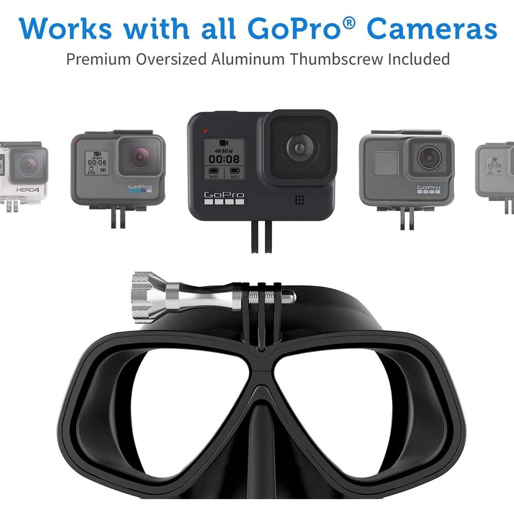 - ? INCLUDES ALUMINUM THUMBSCREW AND TRAVEL BAG with your mask to make easily storing and attaching your GoPro camera a breeze anytime you go scuba diving or snorkeling.