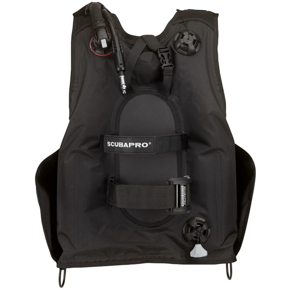 Scubapro's quick-release integrated weight system allows perfect buoyancy and fast weight release in the event of an emergency. All sizes have a 20 lbs (9kg) releasable weight capacity. High profiles, easy to access zippered pockets are reinforced with strong mesh for long wear and quick drying. Great lightweight rotating shoulder strap buckles add comfort and fit. Accessory attachment is made easy with the 5 large size aluminum D-rings placed right where you need them. BC has side grommets for Scubapro knife attachment. There is also an Octopus Holder for easy access in an emergency out-of-air situation. Multiple pull dumps on shoulders and lower rear makes releasing air fast and easy. Depth-compensating cummerbund with quick release waist strap gives a stable and comfortable feel with any exposure suit. BC has an adjustable sternum strap.